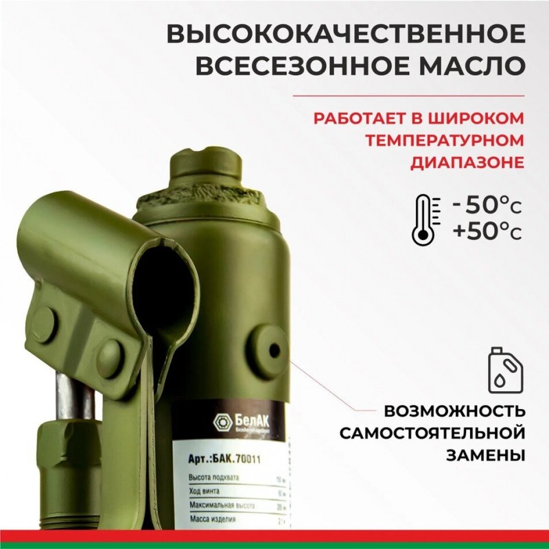 Домкрат ECO 2 тонны «БелАК» БАК.70011 служит для плавного и безопасного подъема автотранспорта весом не более 2 т.
