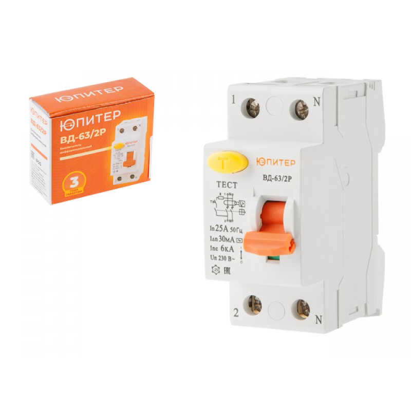 Выключатель дифференциальный (УЗО) ВД-63/2P 25А 30мА 6кА тип AС ЮПИТЕР (электромеханический тип)