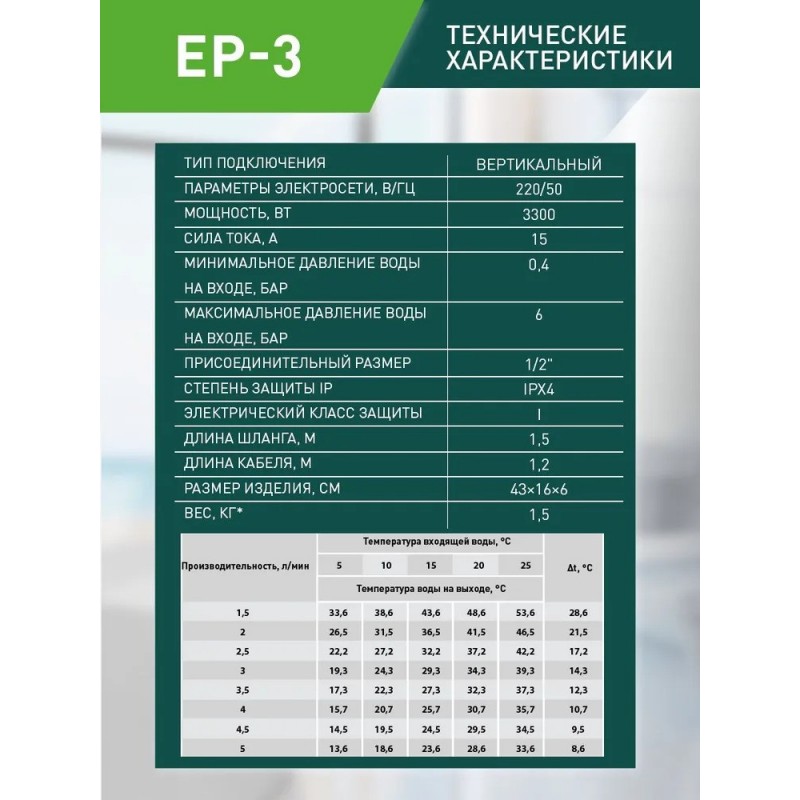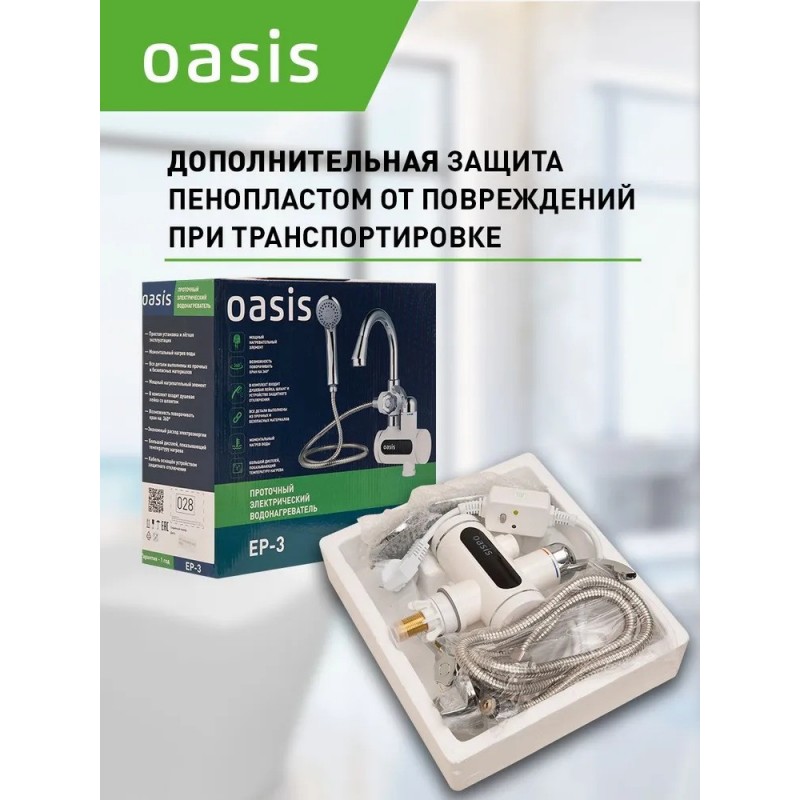 Водонагреватель проточный Oasis EP-3 (3,3кВт, 1,2", 5л/мин, 6бар, душ+кран, дисплей, УЗО)